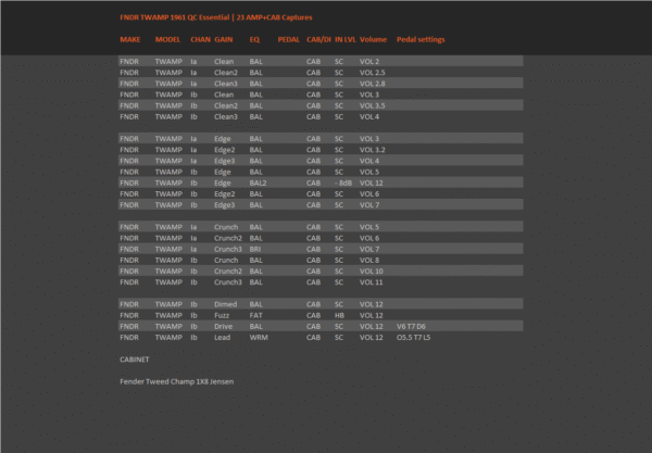 The capture set features 23 full captures and the amp was captured through its original 1X8 cab with Jensen speaker. See a full list of included captures in the product picture section.